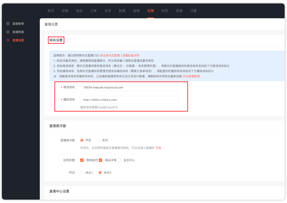 顺应时代趋势 抢占直播红利 1、加快购买决策 主播送券、直播间独享价等多种直播玩法,促进粉丝下单转化。 2、快速拉新拓客 主播在线营销,推动品牌曝光,激活潜在用户,开辟新的流量入口。 3、打造私域流量 实时互动,实现商家与粉丝无缝沟通,提升用户黏性,构建私域流量。 4、优化消费场景 通过主播营造新型消费场景,满足消费者对购物体验的需求。 5、多渠道直播 直播带货支持公众号、小程序等渠道直播;直播海报、链接一键生成,让推广更便捷高效。 业务端 1、直播管理 清晰展现直播列表,了解直播详情,筛选框快速搜索直播,实现全方位直播管理。 2、创建直播预告 快速创建直播预告,提前蓄客引流,曝光直播商品。 3、直播中控台 协助主播管理直播商品,一键设置马甲及禁言管理,支持多种营销活动,快速打造多功能直播间,提升直播氛围。 4、直播数据实时查看 迅速掌握直播间卖货、互动详情,综合管理数据,多维度了解直播情况,方便为下一场直播做准备。 管理端 您可在安菲云管理端进行提前开播、超时失效、超时终止等功能的设置,把控每一场直播进程。 直播间 直播间页面美观大方,功能丰富多样,高效驱动用户视觉体验,助力直播效果翻倍。 直播间多种营销玩法 1、亲密度:粉丝通过完成任务(点赞、订阅、分享等),提升亲密度排行榜名次;从而增强直播间互动率,打造商城人气。 2、分享有礼:海报自动生成,用户自发分享领取相关奖励;助力直播间快速推广,实现引流裂变。 3、直播间优惠券:主播送券+直播间优惠券两种送券方式,用户可通过完成相关任务领取优惠券;有效提升粉丝活跃度,激发用户购买欲。 主播端 主播开播无需借助任何软件,店铺助手小程序助力主播轻松开播。 直播设置 开播前需要用户提前购买直播流量,设置推流域名和播放域名。 建议您使用腾讯云直播CSS ,下面是腾讯云直播