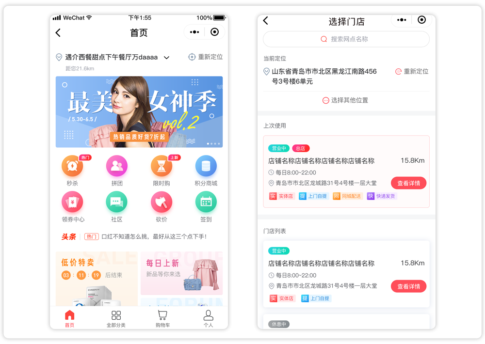 买家:根据所在位置推荐附近门店,门店列表自由切换;买家也可根据自身需求选择其他区域的门店;